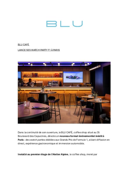 Dans la continuité de son ouverture, le Blu Café, coffee-shop situé au 35 Boulevard des Capucines, dévoile un nouveau format événementiel inédit à Paris : des watch parties dédiées aux Grands Prix de Formule 1, alliant diffusion en direct, expérience gastronomique et immersion automobile.