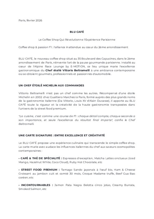Un lieu singulier qui crée l’alliance inattendue entre gastronomie étoilée et univers de la Formule 1. Aux commandes : le chef Vittorio Beltramelli, étoilé Michelin en 2002, formé auprès de grandes maisons italiennes, qui transpose aujourd’hui l’exigence de la haute gastronomie dans une proposition de street-food premium créative et accessible.
