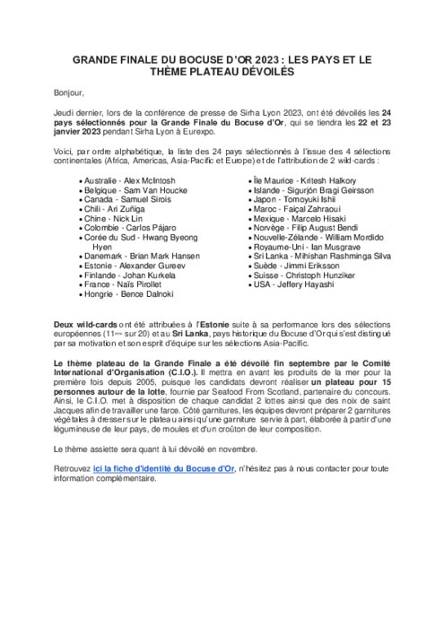 Métiers 11 octobre 2022 - 15:31 Le thème plateau de la Grande Finale a été dévoilé fin septembre par le Comité International d’Organisation (C.I.O.). PDF (135 Ko) Télécharger