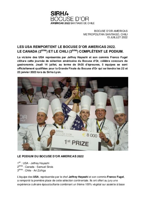Métiers 15 juillet 2022 - 11:55 Les sélections américaines des prestigieux concours de pâtisserie, Coupe du Monde de la Pâtisserie, et de gastronomie, Bocuse d’Or, se sont tenues respectivement les 13 et 14 juillet à Santiago, Chili. PDF (402 Ko) Télécharger