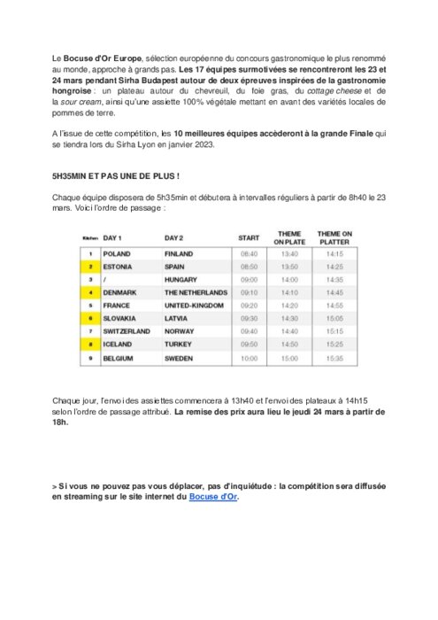 Métiers 17 mars 2022 - 14:12 Le Bocuse d’Or Europe, sélection européenne du concours gastronomique le plus renommé au monde, approche à grands pas. PDF (143 Ko) Télécharger