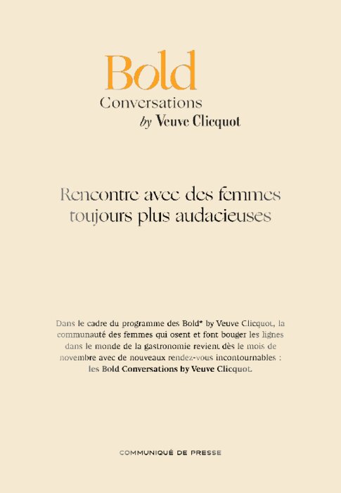 Dans le cadre du programme des Bold by Veuve Clicquot, la communauté des femmes qui osent et font bouger les lignes dans le monde de la gastronomie revient dès le mois de novembre avec de nouveaux rendez-vous incontournables : les Bold Conversations by Veuve Clicquot.