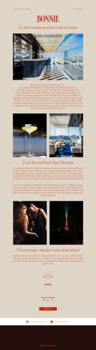 Au sommet de l’hôtel SO/ Paris dans la tour Morland (IVe), Bonnie s’impose comme l’un des bars les plus spectaculaires de Paris. Suspendu entre ciel et Seine, ce lieu emblématique offre une vue panoramique saisissante, de l’île Saint-Louis à la tour Eiffel, en passant par la Bastille et Montmartre. À la nuit tombée lorsque la ville s’illumine, Bonnie devient le théâtre d’une nuit parisienne réinventée. Imaginé comme un écrin sensuel, le décor mêle moquette bleu nuit, bar en pierre noire, comptoir marbré, le tout sublimé par les jeux de miroirs et cubes lumineux d’Olafur Eliasson.