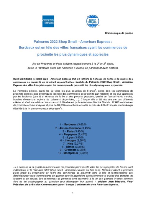American Express présente son palmarès des villes françaises aux commerces de proximité les plus dynamiques et appréciés, mené avec Statista.