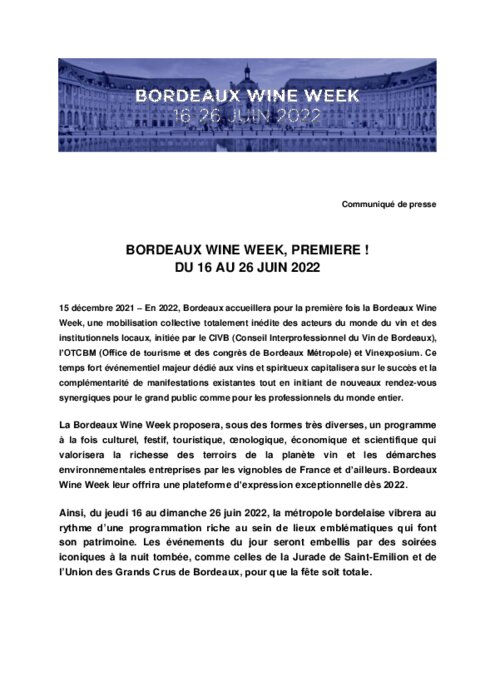 En 2022, Bordeaux accueillera pour la première fois la Bordeaux Wine Week, une mobilisation collective totalement inédite des acteurs du monde du vin et des institutionnels locaux, initiée par le CIVB (Conseil Interprofessionnel du Vin de Bordeaux), l’OTCBM (Office de tourisme et des congrès de Bordeaux Métropole) et Vinexposium.