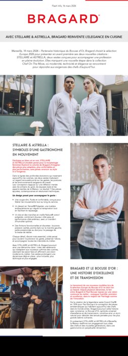 Partenaire historique du Bocuse d’Or, Bragard choisit la sélection Europe 2026 pour présenter en avant première ses deux nouvelles créations : Stellaire et Astrella, deux vestes conçues pour accompagner une profession en pleine évolution. Elles marquent une nouvelle étape dans la collection Chef On The Move, où modernité, technicité et élégance se rencontrent pour répondre aux exigences des chefs d’aujourd’hui.
