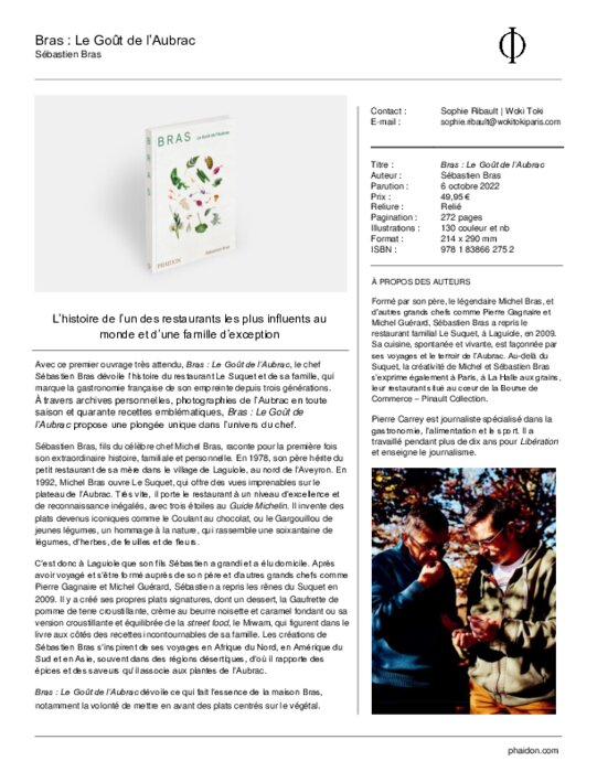 Avec ce premier ouvrage , Bras : Le Goût de l’Aubrac, le chef Sébastien Bras dévoile l’histoire du restaurant Le Suquet et de sa famille, qui marque la gastronomie française de son empreinte depuis trois générations.