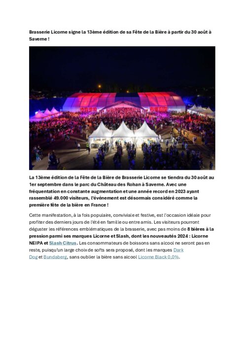 La 13e édition de la Fête de la Bière de Brasserie Licorne se tiendra du 30 août au 1er septembre dans le parc du Château des Rohan à Saverne. Avec une fréquentation en constante augmentation et une année record en 2023 ayant rassemblé 49.000 visiteurs, l’événement est désormais considéré comme la première fête de la bière en France !