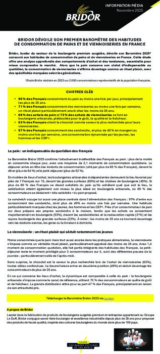 Bridor, leader du secteur de la boulangerie premium surgelée, dévoile son Baromètre 2025 consacré aux habitudes de consommation de pains et de viennoiseries en France. Cette étude offre une analyse approfondie des comportements d'achat et des tendances, essentielle pour mieux comprendre le marché. Alors que le pain conserve son statut d'indispensable au quotidien, la consommation de viennoiseries s'affirme davantage comme un rituel plaisir, avec des spécificités marquées selon les générations.