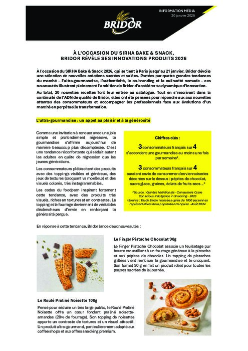 Au total, 20 nouvelles recettes font leur entrée au catalogue. Tout en s’inscrivant dans la continuité de l’ADN de qualité de Bridor, elles ont été pensées pour répondre aux aux nouvelles attentes des consommateurs et accompagner les professionnels face aux évolutions d’un marché en perpétuelle transformation.