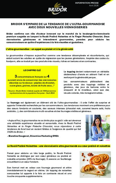 Bridor confirme son rôle d’acteur innovant sur le marché de la boulangerie-viennoiserie premium surgelée en lançant le Roulé Praliné Noisettes et le Finger Pistache Chocolat. Deux viennoiseries généreuses et intensément gourmandes, pensées pour séduire les consommateurs en quête d’expériences à la fois visuelles et gustatives.