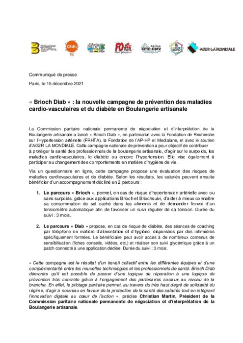 La Commission paritaire nationale permanente de négociation et d’interprétation de la Boulangerie artisanale a lancé « Brioch Diab », en partenariat avec la Fondation de Recherche sur l’Hypertension artérielle (FRHTA), la Fondation de l’AP-HP et Medialane, et avec le soutien d’AG2R LA MONDIALE.