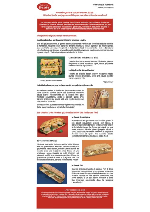 Cet automne, Brioche Dorée continue de cultiver sa spécialité viennoisière et dévoile une collection de recettes inédites, inspirées des tendances food du moment et portées par une forte exigence de qualité. Une collection généreuse, fondante et résolument actuelle, à découvrir dès le 14 octobre dans l’ensemble des restaurants Brioche Dorée.