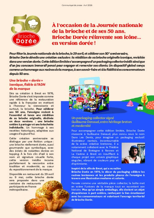 Pour fêter la Journée nationale de la brioche, le 29 avril, et célébrer son 50e anniversaire, Brioche Dorée dévoile une création exclusive : la réédition de sa brioche originelle iconique, revisitée dans une version dorée. Cette édition limitée s’accompagne d’un packaging collector inédit ainsi que d’un jeu concours immersif pensé pour engager et remercier ses clients. Un dispositif global conçu comme un hommage aux racines de la marque, à son savoir-faire et à la fidélité des consommateurs depuis 50 ans.
