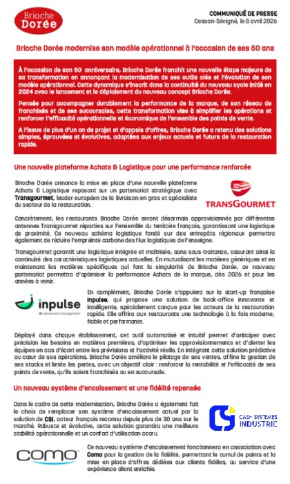 A l'occasion de son 50e anniversaire, Brioche Dorée franchit une nouvelle étape majeure de sa transformation en annonçant la modernisation de ses outils clés et l'évolution de son modèle opérationnel. Cette dynamique s'inscrit dans la continuité du nouveau cycle initié en 2024 avec le lancement et le déploiement du nouveau concept Brioche Dorée.