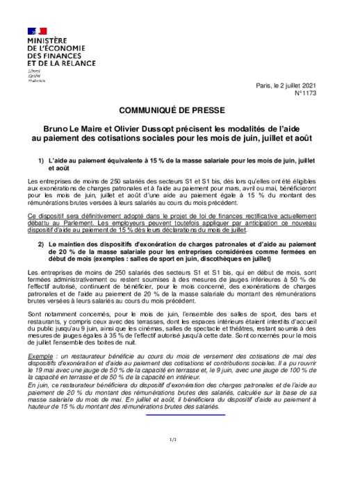 Métiers 02 juillet 2021 - 08:34 L’aide au paiement équivalente à 15 % de la masse salariale pour les mois de juin, juillet et août PDF (183 Ko) Télécharger