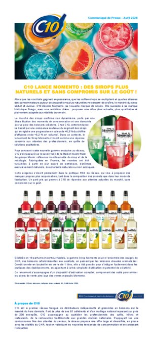 Alors que les cocktails gagnent en puissance, que les coffee shops se multiplient et que les attentes des consommateurs autour de propositions plus naturelles ne cessent de croître, le marché du sirop séduit et évolue. C10 dévoile Momento, sa nouvelle marque de sirops. Elle succède à sa marque historique Fuego, avec une ambition claire : proposer une offre plus actuelle, plus qualitative et pleinement adaptée aux réalités du terrain.