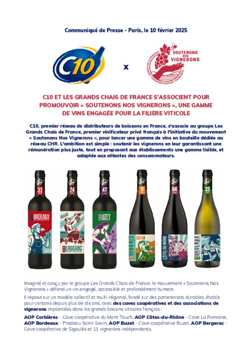 C10, premier réseau de distributeurs de boissons en France, s'associe au groupe Les Grands Chais de France, premier vinificateur privé français à l'initiative du mouvement « Soutenons Nos Vignerons », pour lancer une gamme de vins en bouteille dédiée au réseau CHR. L'ambition est simple : soutenir les vignerons en leur garantissant une rémunération plus juste, tout en proposant aux établissements une gamme lisible, et adaptée aux attentes des consommateurs.