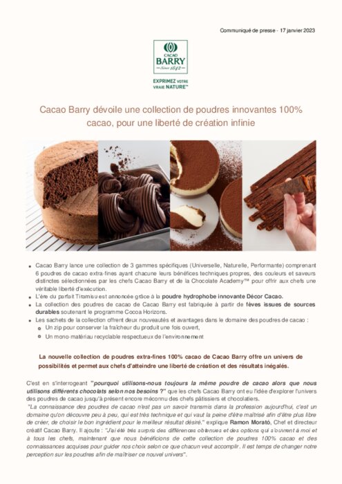 Cacao Barry lance une collection de 3 gammes spécifiques (Universelle, Naturelle, Performante) comprenant 6 poudres de cacao extra-fines ayant chacune leurs bénéfices techniques propres, des couleurs et saveurs distinctes sélectionnées par les chefs Cacao Barry et de la Chocolate Academy pour offrir aux chefs une véritable liberté d’exécution.