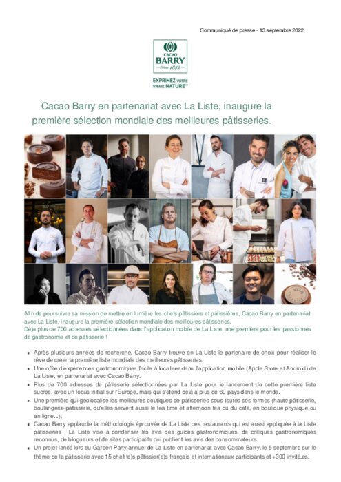 Fournisseurs 13 septembre 2022 - 14:45 Déjà plus de 700 adresses sélectionnées dans l’application mobile de La Liste, une première pour les passionnés de gastronomie et de pâtisserie . PDF (396 Ko) Télécharger
