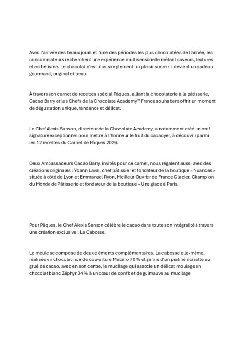 Fournisseurs 02 février 2026 - 09:08 À travers son carnet de recettes spécial Pâques, alliant la chocolaterie à la pâtisserie, Cacao Barry et les Chefs de la Chocolate Academy France souhaitent offrir un moment de dégustation unique, tendance et délicat. PDF (60 Ko) Télécharger caacao barry