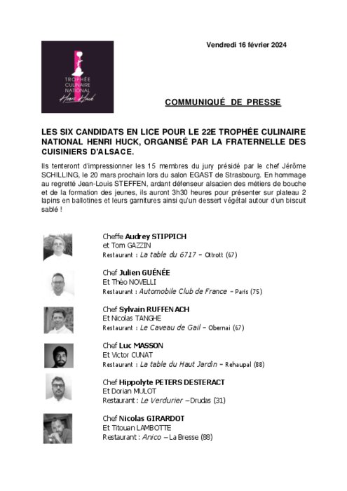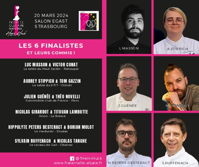 Ils tenteront d’impressionner les 15 membres du jury présidé par le chef Jérôme SCHILLING, le 20 mars prochain lors du salon EGAST de Strasbourg. En hommage au regretté Jean-Louis STEFFEN, ardant défenseur alsacien des métiers de bouche et de la formation des jeunes, ils auront 3h30 heures pour présenter sur plateau 2 lapins en ballotines et leurs garnitures ainsi qu’un dessert végétal autour d’un biscuit sablé