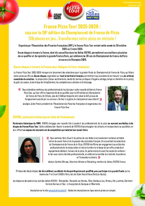 Douze étapes à travers la France, dont dix accueillies dans les Halles Metro, permettront aux meilleurs pizzaiolos de se qualifier et de rejoindre la grande finale à Paris, qui célèbrera les 20 ans du Championnat de France de Pizza et sacrera le Champion 2026.