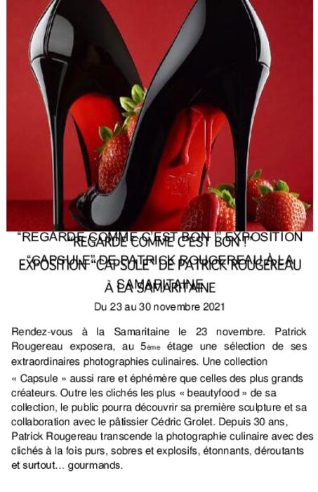 Rendez-vous à la Samaritaine le 23 novembre. Patrick Rougereau exposera, au 5ème étage une sélection de ses extraordinaires photographies culinaires. Une collection « Capsule » aussi rare et éphémère que celles des plus grands créateurs.