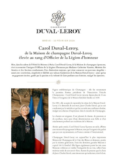 Dans les salons de l’Hôtel de Brienne à Paris, Carol Duval-Leroy, de la Maison de champagne éponyme, s’est vu remettre l’insigne d’Officier de la Légion d’honneur par Madame Catherine Vautrin, Ministre des Armées et des Anciens combattants. Une distinction majeure, qui vient consacrer un parcours singulier - mené avec conviction, simplicité et fidélité aux valeurs fondatrices de la Maison Duval-Leroy - ainsi qu’un engagement sincère, guidé par la passion et la volonté de faire perdurer une histoire, malgré les épreuves.
