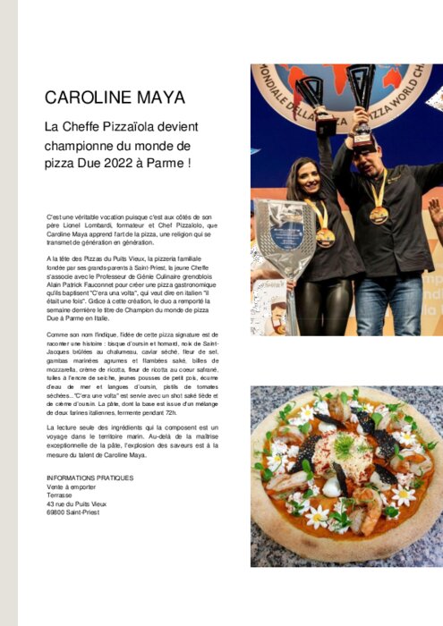 Métiers 20 avril 2022 - 09:50 C'est une véritable vocation puisque c'est aux côtés de son père Lionel Lombardi, formateur et Chef Pizzaïolo, que Caroline Maya apprend l'art de la pizza, une religion qui se transmet de génération en génération. PDF (281 Ko) Télécharger