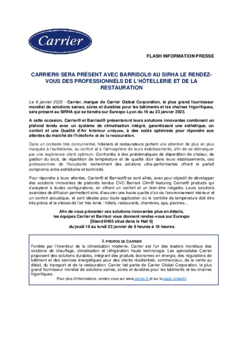 Carrier, marque de Carrier Global Corporation, le plus grand fournisseur mondial de solutions saines, sûres et durables pour les bâtiments et les chaînes frigorifiques, sera présent au SIRHA qui se tiendra sur Eurexpo Lyon du 19 au 23 janvier .