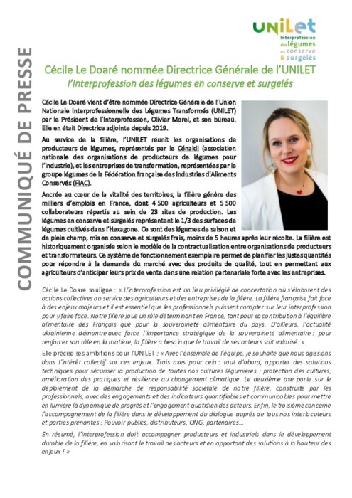Métiers 04 avril 2022 - 10:40 Cécile Le Doaré vient d’être nommée Directrice Générale de l’Union Nationale Interprofessionnelle des Légumes Transformés (UNILET) par le Président de l’Interprofession, Olivier Morel, et son bureau. Elle en était Directrice adjointe depuis 2019. PDF (246 Ko) Télécharger