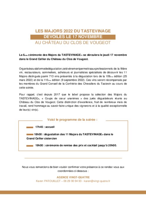 Organisé sous la forme de dégustation, cet événement permettra aux professionnels de la filière vin, restaurateurs, sommeliers, acheteurs et journalistes spécialisés de découvrir les 11 Majors distingués parmi 713 vins présentés à la dégustation lors de la 109ème édition (25 mars 2022) et de la 110ème édition (9 septembre 2022).