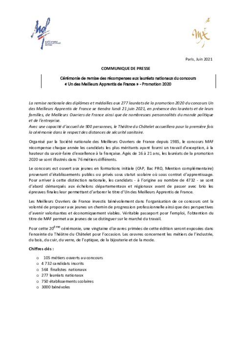 La remise nationale des diplômes et médailles aux 277 lauréats de la promotion 2020 du concours Un des Meilleurs Apprentis de France se tiendra lundi 21 juin 2021, en présence des lauréats et de leurs familles, de Meilleurs Ouvriers de France ainsi que de nombreuses personnalités du monde politique et de l’entreprise.