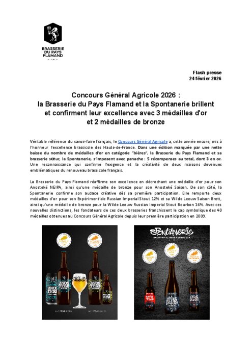 Véritable référence du savoir-faire français, le Concours Général Agricole a, cette année encore, mis à l’honneur l’excellence brassicole des Hauts-de-France. Dans une édition marquée par une nette baisse du nombre de médailles d’or en catégorie “bières”, la Brasserie du Pays Flamand et sa brasserie sœur, la Spontanerie, s’imposent avec panache : 5 récompenses au total, dont 3 en or. Une reconnaissance qui confirme l’exigence et la créativité de deux maisons devenues emblématiques du renouveau brassicole français.