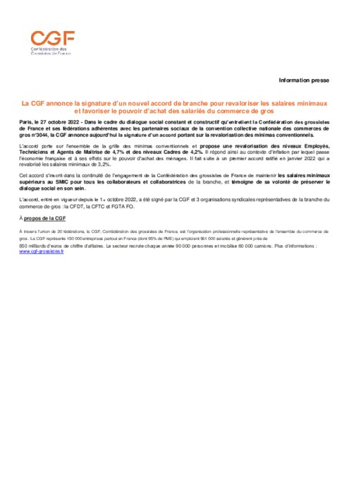 Métiers 27 octobre 2022 - 15:38 L’accord porte sur l’ensemble de la grille des minimas conventionnels et propose une revalorisation des niveaux Employés, Techniciens et Agents de Maîtrise de 4,7% et des niveaux Cadres de 4,2%. PDF (112 Ko) Télécharger