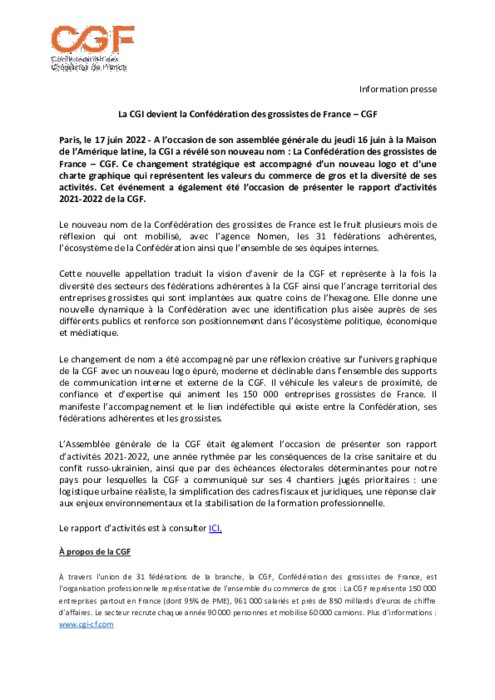 Métiers 17 juin 2022 - 10:14 A l’occasion de son assemblée générale du jeudi 16 juin à la Maison de l’Amérique latine, la CGI a révélé son nouveau nom : La Confédération des grossistes de France – CGF. PDF (137 Ko) Télécharger