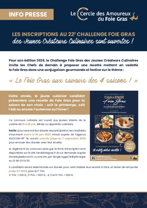 Pour son édition 2026, le Challenge Foie Gras des Jeunes Créateurs Culinaires invite les chefs de demain à proposer une recette mettant en vedette le Foie Gras dans une conjugaison gourmande et festive sur le thème : « Le Foie Gras aux saveurs des 4 saisons ! »
