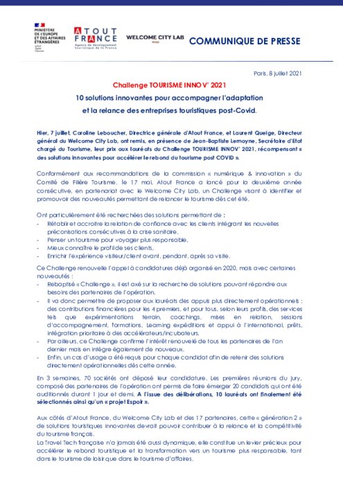 Métiers 08 juillet 2021 - 10:18 10 solutions innovantes pour accompagner l’adaptation et la relance des entreprises touristiques post-Covid. PDF (244 Ko) Télécharger