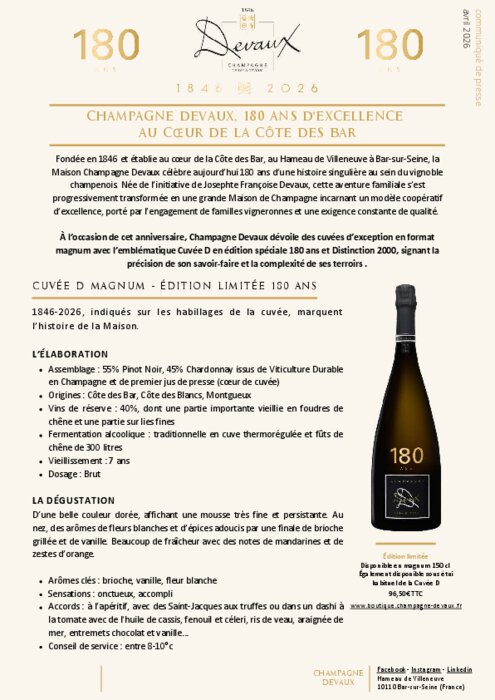 A l’occasion de cet anniversaire, Champagne Devaux dévoile des cuvées d’exception en format magnum avec l’emblématique Cuvée D en édition spéciale 180 ans et Distinction 2000, signant la précision de son savoir-faire et la complexité de ses terroirs .