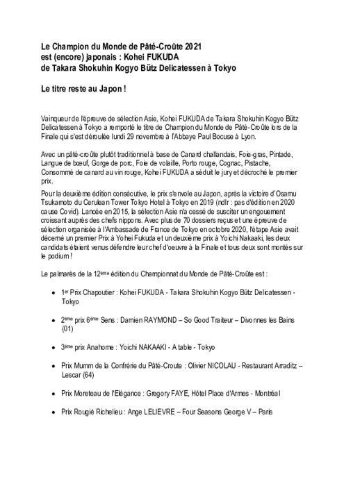 Le champion du Monde de pâté-croûte 2021, Kohei Fukuda, est de nouveau japonais