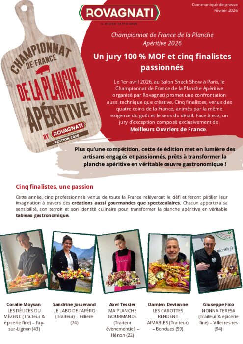 Le 1er avril, au Salon Snack Show à Paris, le Championnat de France de la Planche Apéritive organisé par Rovagnati promet une confrontation aussi technique que créative. Co-animée par Alexandre Hurtaud, Directeur France de Rovagnati, et Véronique Jourdain-Rumé, Championne 2023, cette 4e édition mettra en lumière 5 finalistes motivés et prêts à se démarquer.