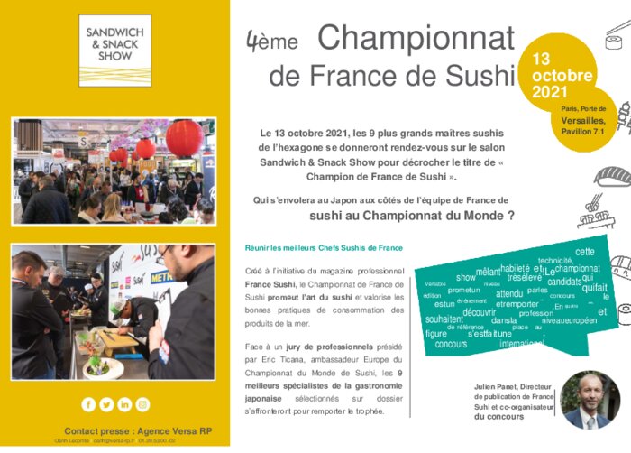 Métiers 08 septembre 2021 - 17:38 Créé à l’initiative du magazine professionnel France Sushi, le Championnat de France de Sushi promeut l’art du sushi et valorise les bonnes pratiques de consommation des produits de la mer. PDF (505 Ko) Télécharger
