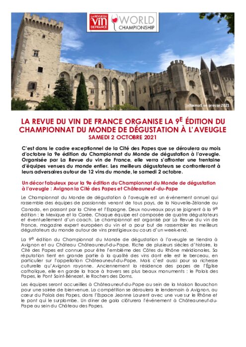 Métiers 15 septembre 2021 - 09:53 C’est dans le cadre exceptionnel de la Cité des Papes que se déroulera au mois d’octobre la 9e édition du Championnat du Monde de dégustation à l’aveugle. PDF (465 Ko) Télécharger