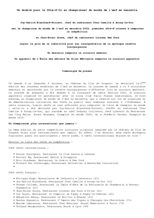 Métiers 09 octobre 2022 - 21:01 La 4ème édition de cette compétition culinaire originale imaginée par le Château du Clos de Vougeot était plus internationale que jamais. PDF (22 Ko) Télécharger