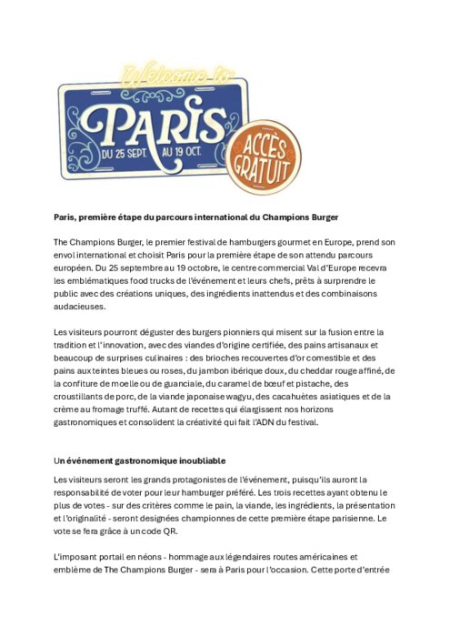 Métiers 24 septembre 2025 - 16:30 L’événement gastronomique qui bat des records avec près de 4 millions de visiteurs en Espagne, a choisi Paris comme première étape de son parcours international. PDF (177 Ko) Télécharger credit Champions Burger