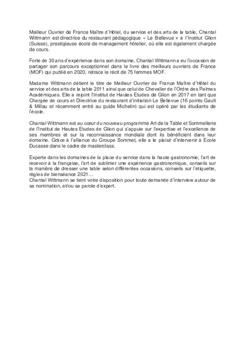 Meilleur Ouvrier de France Maître d’Hôtel, du service et des arts de la table, Chantal Wittmann est directrice du restaurant pédagogique « Le Bellevue » à l’Institut Glion (Suisse), prestigieuse école de management hôtelier, où elle est également chargée de cours.