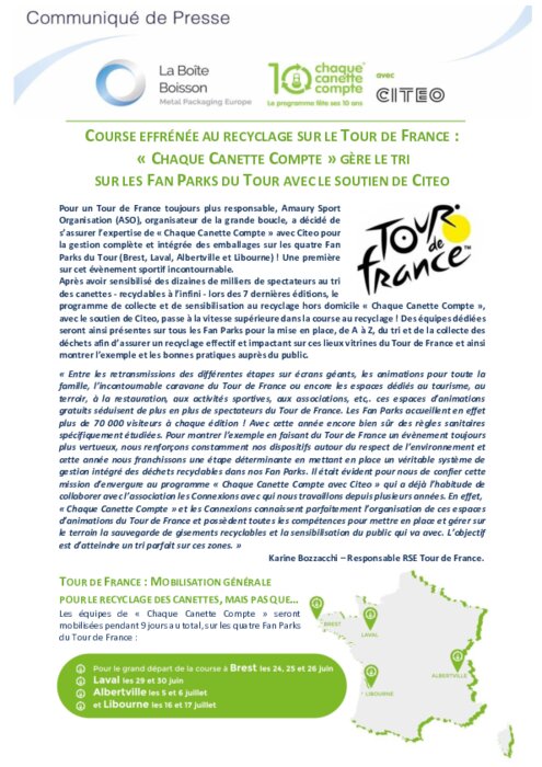 Pour un Tour de France toujours plus responsable, Amaury Sport Organisation (ASO), organisateur de la grande boucle, a décidé de s'assurer l'expertise de « Chaque Canette Compte » avec Citeo pour la gestion complète et intégrée des emballages sur les quatre Fan Parks du Tour (Brest, Laval, Albertville et Libourne) !