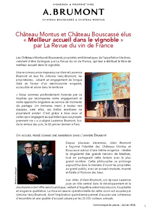 Fournisseurs 14 janvier 2026 - 11:06 Une reconnaissance majeure pour Alain et Laurence Brumont et leur fils Antoine Veiry-Brumont, les propriétaires, saluant un engagement de longue date en faveur d’un œnotourisme exigeant, accessible et ancré dans le territoire. PDF (984 Ko) Télécharger