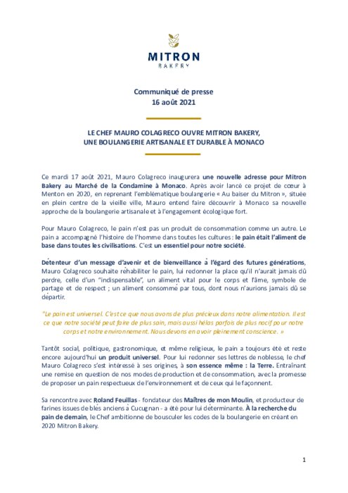 Mauro Colagreco inaugure une nouvelle adresse pour Mitron Bakery au Marché de la Condamine à Monaco. Après avoir lancé ce projet de cœur à Menton en 2020, en reprenant l’emblématique boulangerie « Au baiser du Mitron », située en plein centre de la vieille ville, Mauro entend faire découvrir à Monaco sa nouvelle approche de la boulangerie artisanale et à l’engagement écologique fort.